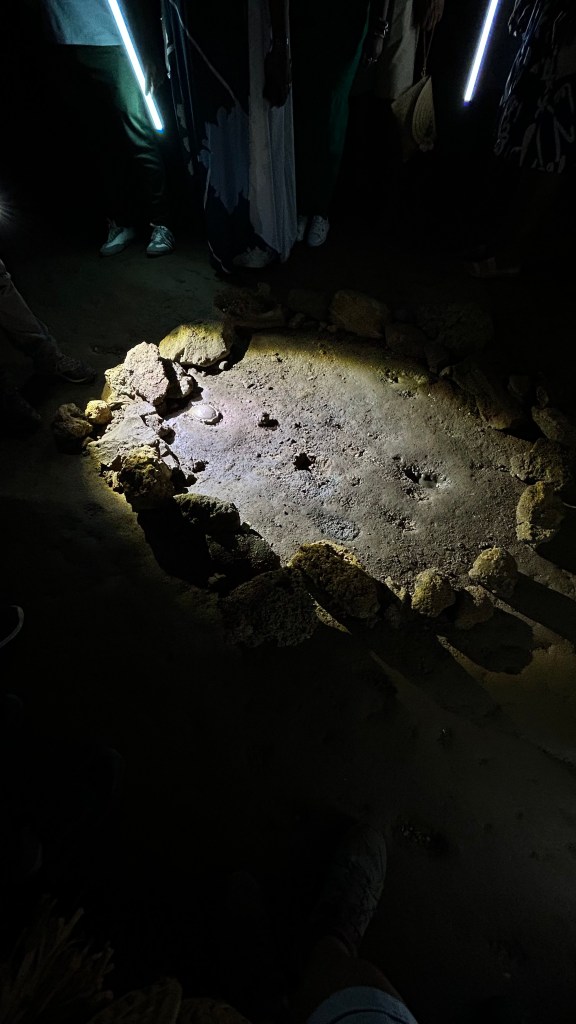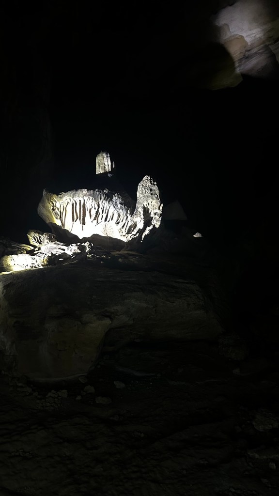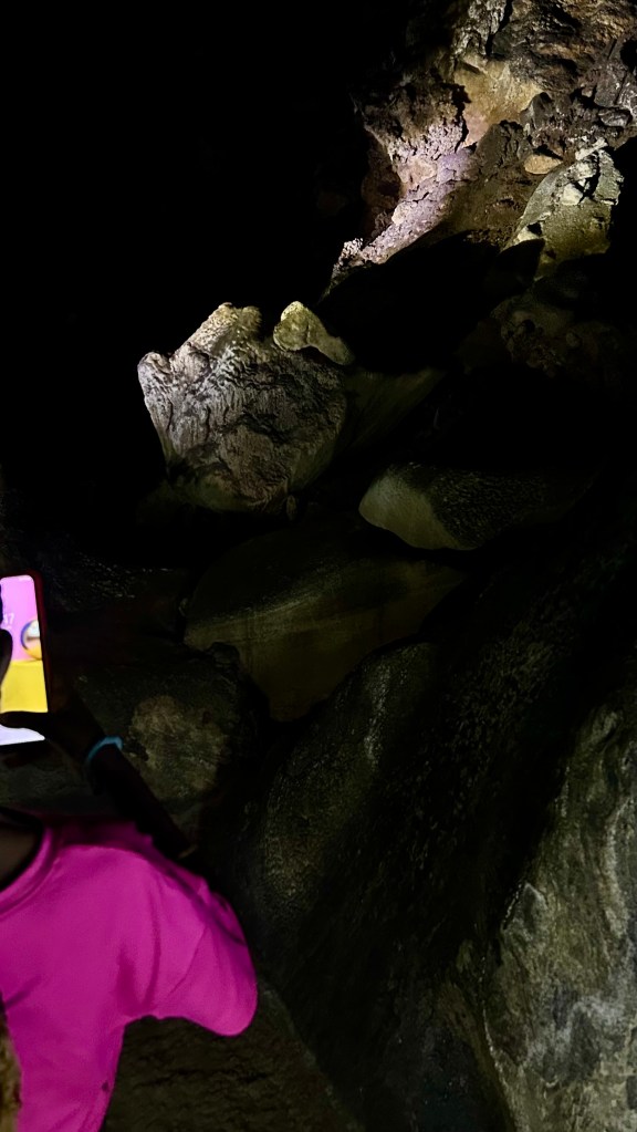 C’est une immense grotte longue de 1,3km, mais on ne peut en explorer que 600 m sans ramper et aboutir dans l’océan. Elle est impressionnante par la taille et la hauteur de ses chambres, mais les stalactites et les stalagmites sont identiques à celles de la précédente grotte et au grès des formes diverses chaque imagination reconnaît ses propres figures: Churchill et son cigare, un dodo obèse, une tortue, Ganesh, ou Buckingham Palace…