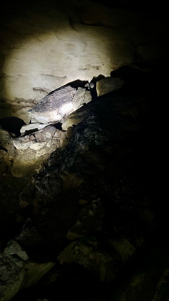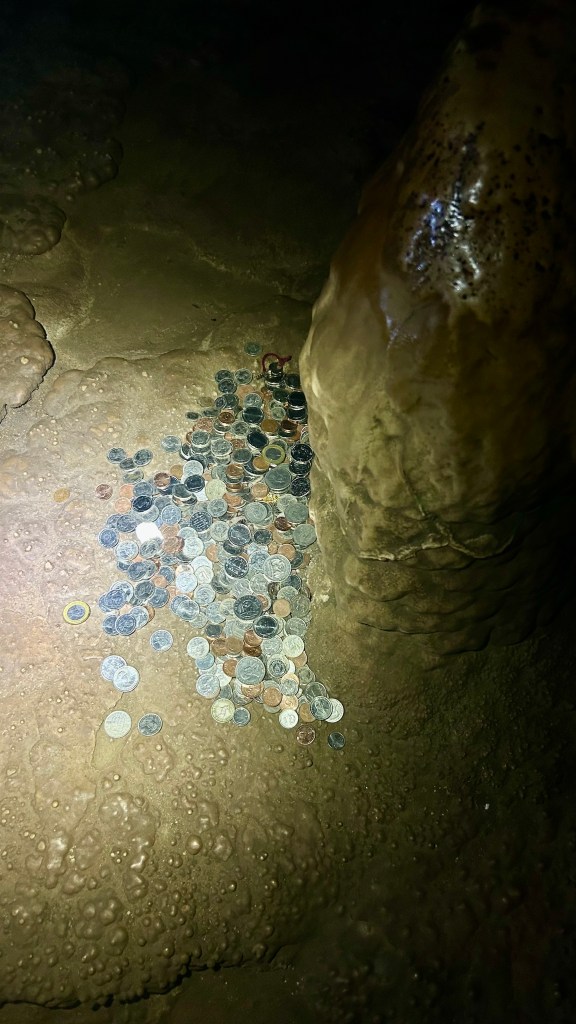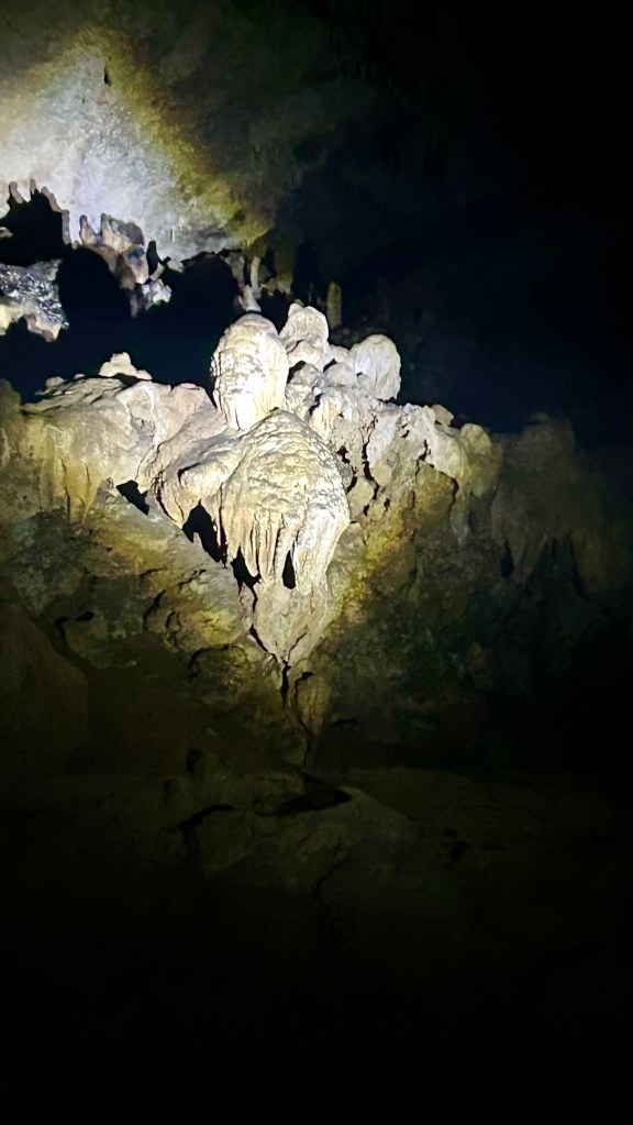 It’s a huge cave, 1.3 km long, but only 600 m can be explored without crawling and ending up in the ocean. It is impressive in the size and height of its chambers, though the stalactites and stalagmites are similar to those in the previous cave, and as always the shapes inspire personal interpretations: Churchill with his cigar, a fat dodo, a turtle, Ganesh, or Buckingham Palace…