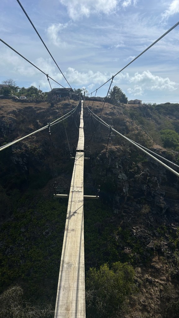 Then, on to the suspension bridge: the first time in my life I’ve been able to walk above two paille-en-queue birds in flight! Both poetic and terrifying — walking in the wind, above a deep ravine, on a twenty-centimeter-wide plank that feels like it might flip you over, really gets the adrenaline going… even though you know it won’t, and even though you’re secured with a harness and carabiner. On my way out I run into Albert George again — an elderly, very peculiar gentleman who had seemed quite taken with Jacek during our first visit, and who told him the story of his late father. This time he calls out to me as if we were old friends, in Creole: “Ki manièr?”