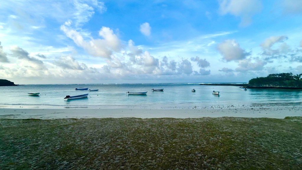 Puis après un bref retour à la maison direction la plus jolie plage de l’île: coton beach! Magnifique baie de sable fin blanc devant un beau lagon et quelques petits bateaux de pêche colorés!